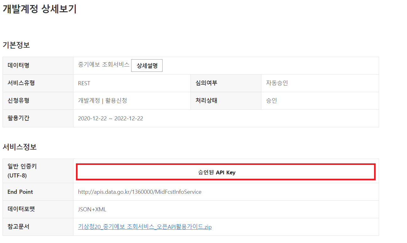 승인된 API키는 마이페이지 - [승인] 중기예보 조회서비스 에서 아래와 같이 확인 가능하다.