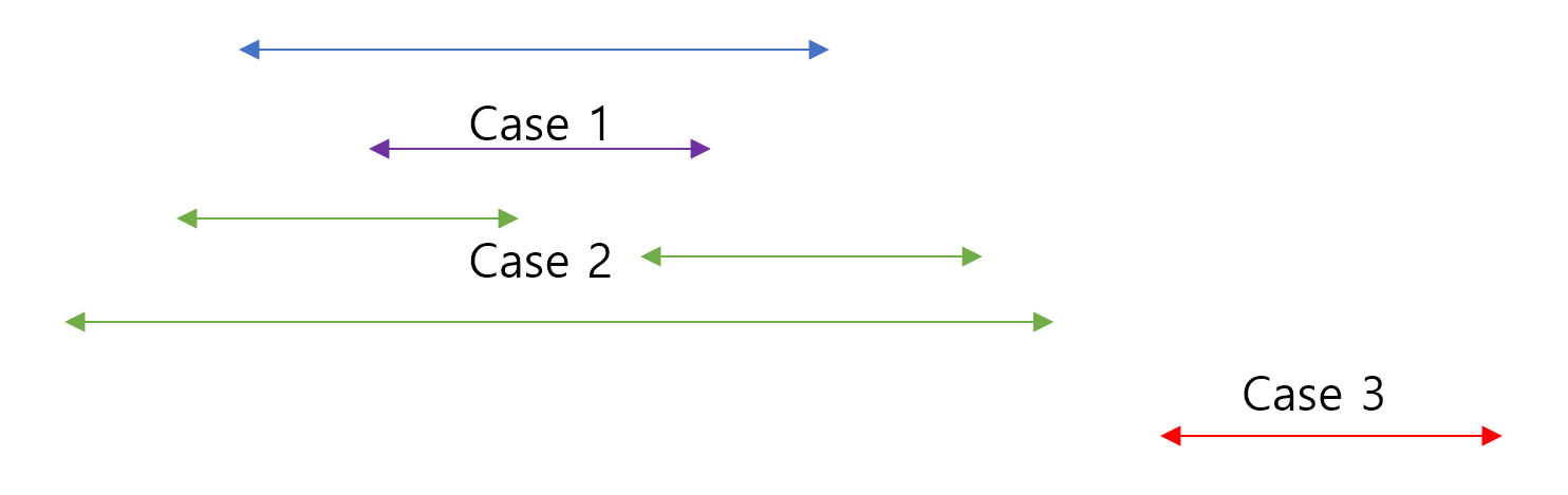 > case 2 : s가 end_point보다 크면 더 이상 겹칠 수 있는 게 나오지 않으므로 길이 구해서(end_point - start_point) 누적하고 s, e를 start_point, end_point에 넣어줌