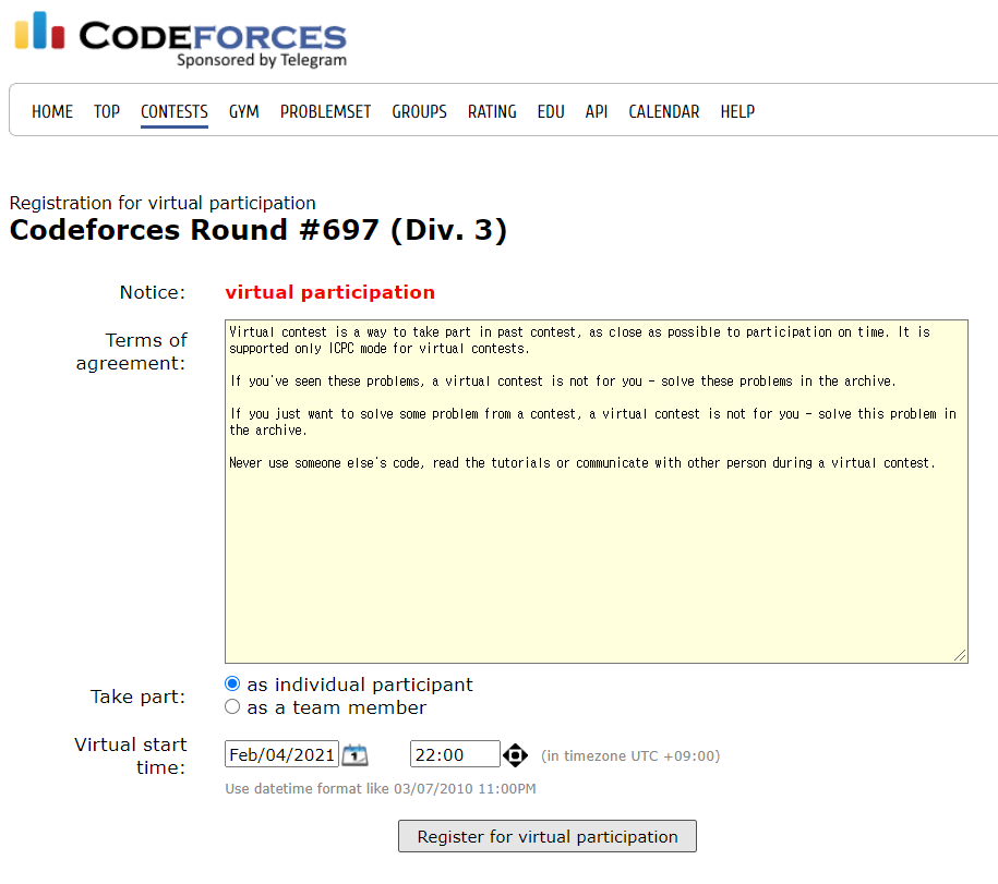 실제 Contest에 참여한 것처럼 해주는 Vitual participation이라는 서비스가 있어서